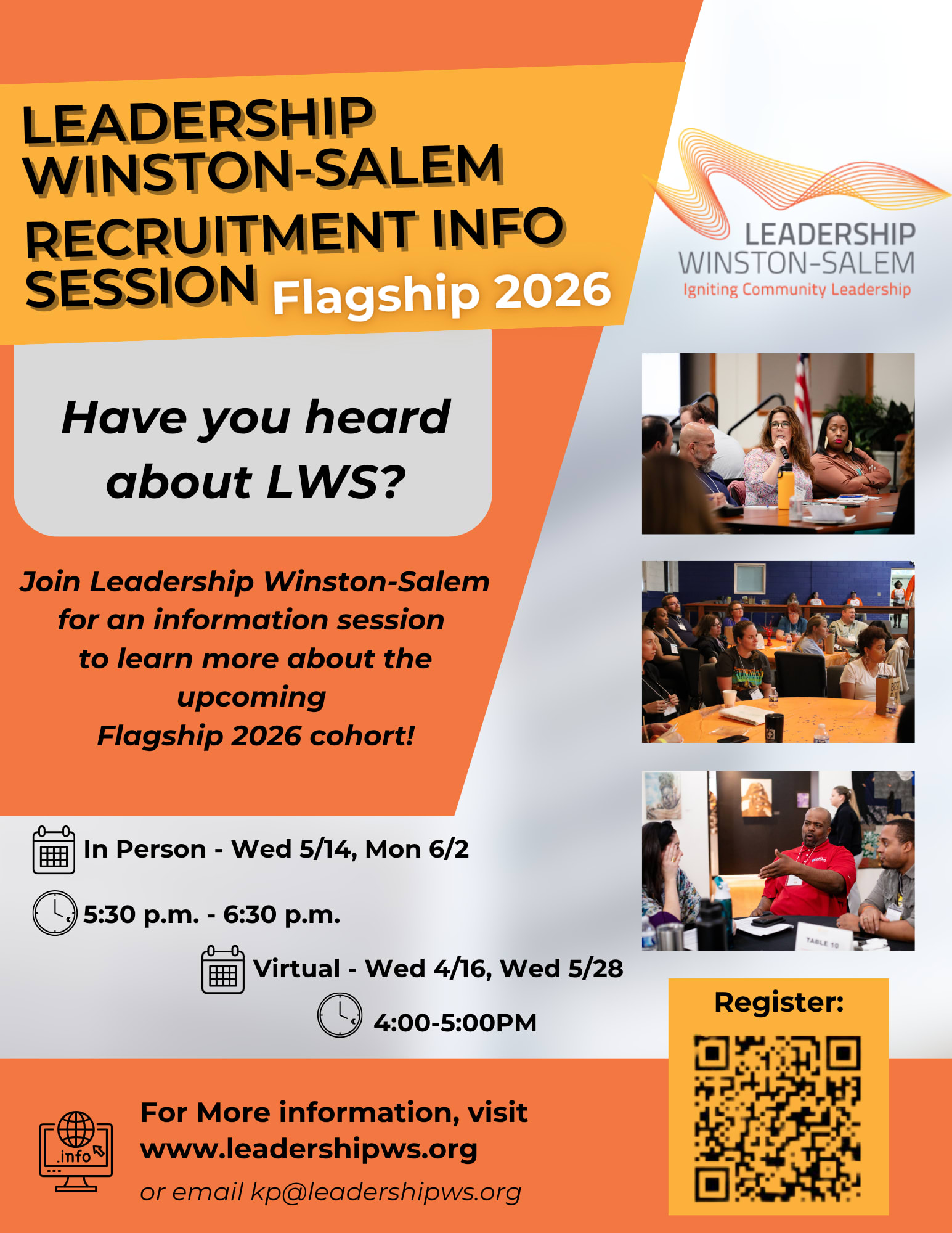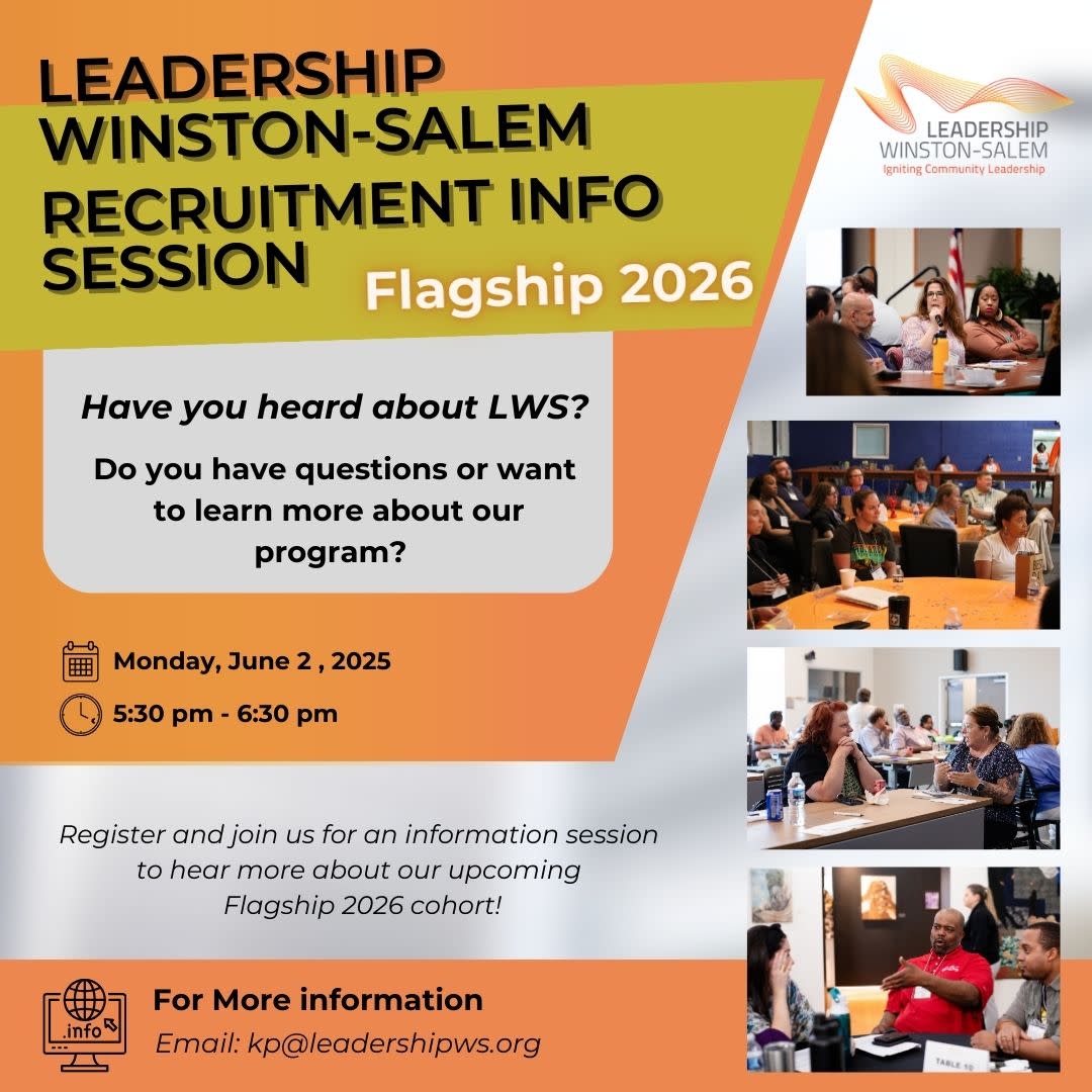 Are you looking to elevate your leadership skills and connect with like-minded professionals in Winston-Salem? Don’t miss this Leadership Winston-Salem Flagship Information Session. This in-person session will give you an insider’s look into Flagship 2026, our exclusive program designed to develop and empower leaders who are passionate about making a difference in our community. The cohort is a dynamic, collaborative group of individuals who come together to challenge each other, share insights, and engage in meaningful projects that impact Winston-Salem’s future. During this session, you’ll have the chance to ask questions, learn about the application process, and find out how this program can help you build a lasting legacy as a community leader.Please Note: While there are multiple dates available, you only need to attend one session.