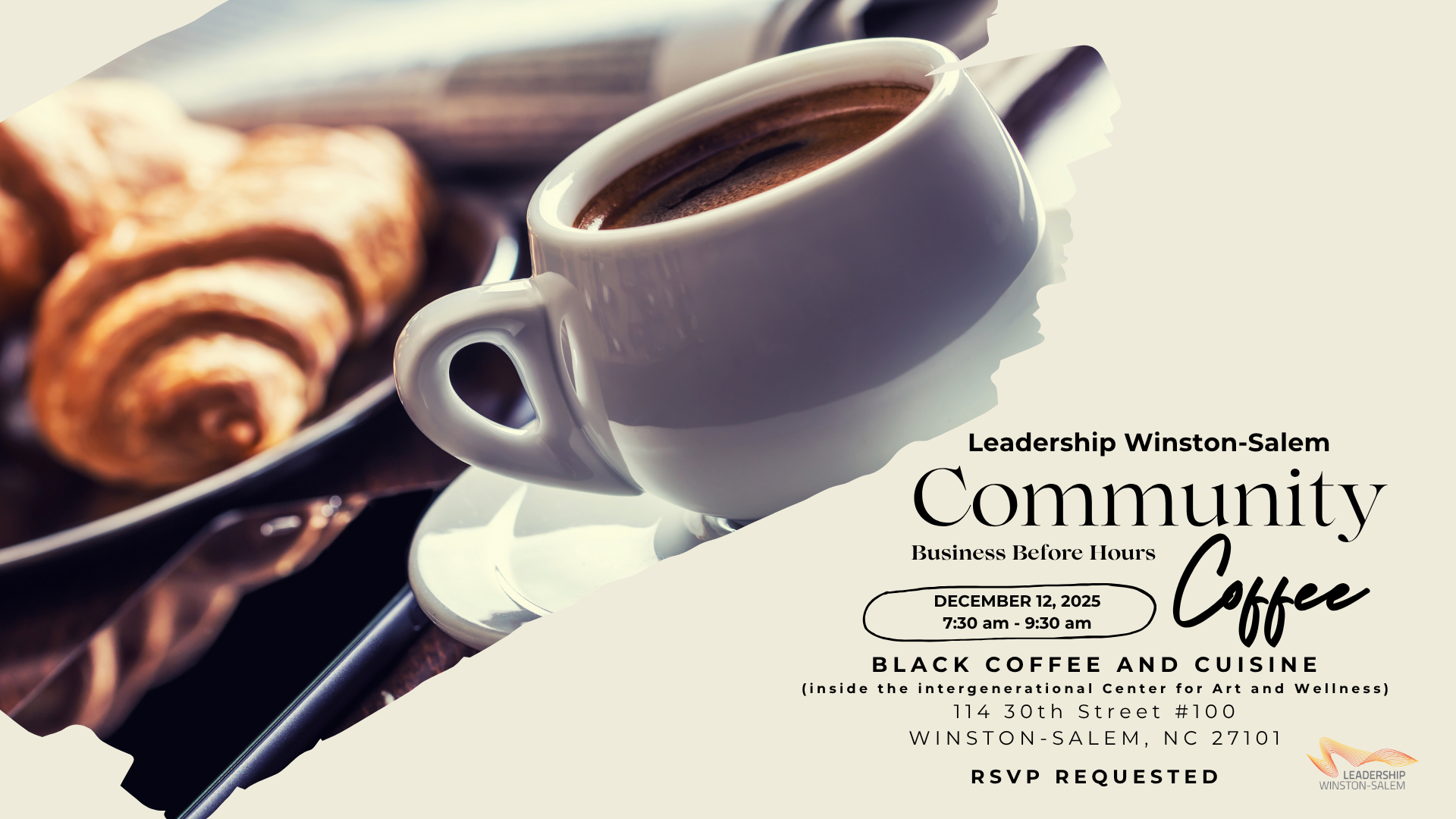 Join Leadership Winston-Salem for our upcoming Community Coffee "Business Before Hours" event. This event is designed to bring our community leaders together to network and support local small businesses. Enjoy a fresh, hot cup of locally brewed coffee and engage in meaningful conversations with like-minded individuals. What a great way to jumpstart your day! We look forward to seeing you there.