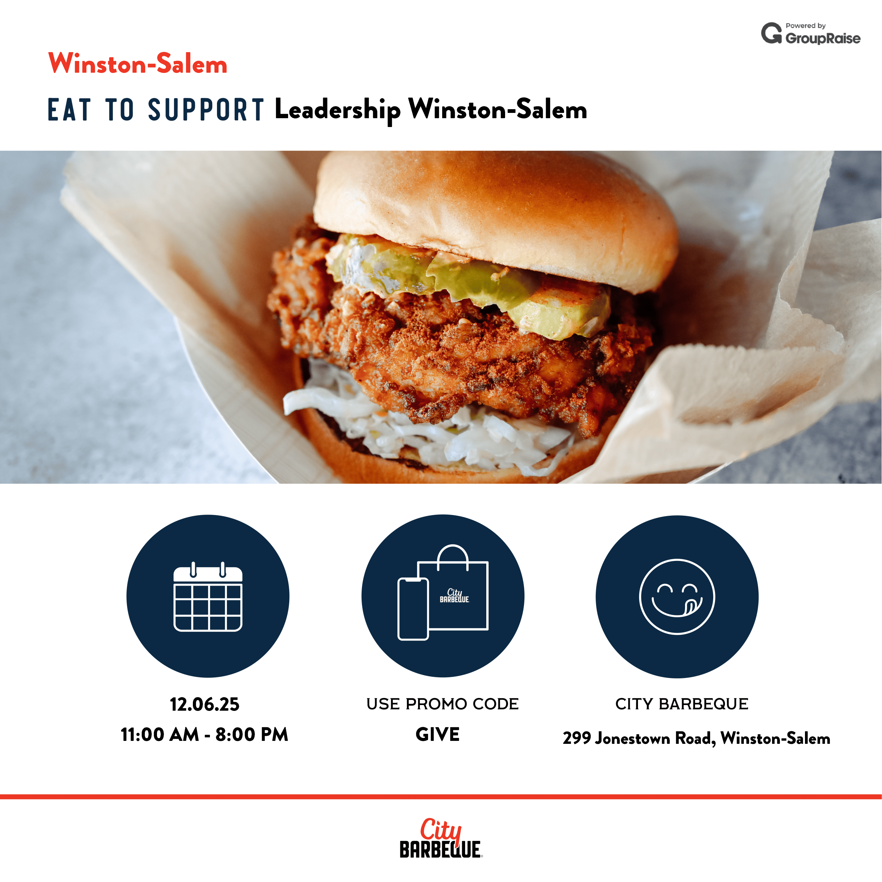 Join Leadership Winston-Salem at City Barbeque on Saturday, December 6, 2025, from 11:00 AM – 8:00 PM for our Dine to Donate: LWS Scholarship Fundraiser. When you mention Leadership Winston-Salem upon ordering or present the fundraiser flier, 20% of your receipt will be donated to our LWS scholarship fund. If ordering online for pickup, use promo code: GIVE